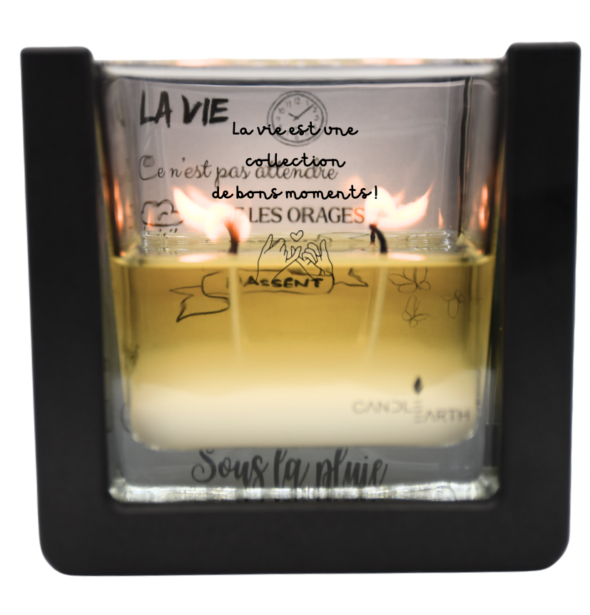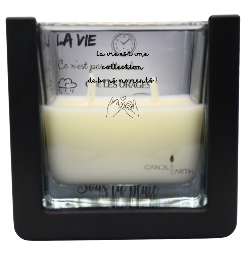 - Cire : 235 g de cire végane parfumée, composée essentiellement de beurre de karité, négatif en carbone